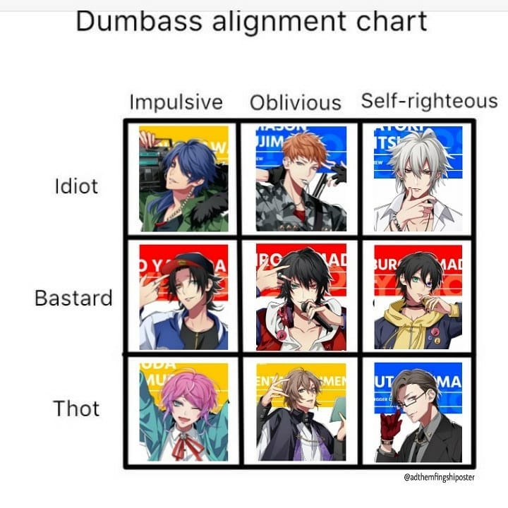 Hypmic figures in the dumbass alignment chart cr.: roddy-key.tumblr.com @/pinterest #memes #shitpost #account #shitposting #absoluteunit #thicc #boi #delightful #dice #dicecat #cat #cats #catto #catmemes #oh #lawd #hes #listed here #masterpiece #hypmic #hypnosismic #dumbassalignmentchart #madtriggercrew #busterbros #matenrou #flingposse #badasstemple #dotsuitarehonpo