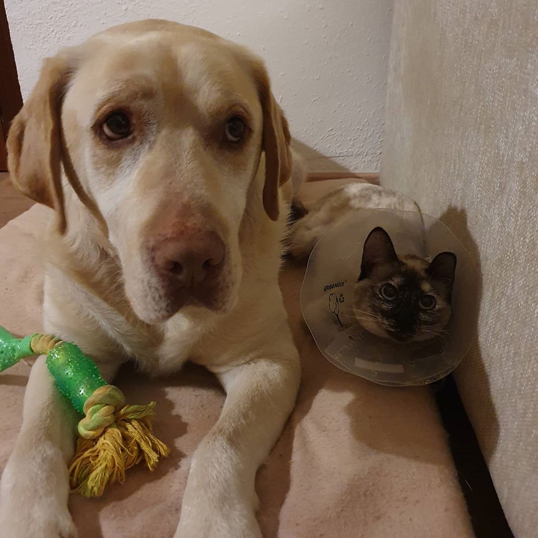 Nosti is operated but her significant brother as a real gentleman will safeguard her from each menace #catsanddogs #dogandcat #catdog #catmemes #catmeme #picneko #nekostagram #labradorsofinstagram #perrosygatos #katzenleben #siamesemix #catdoglove #dogcatlove #kedim #kediler #koty #nekostagram #petlove #labradorlove