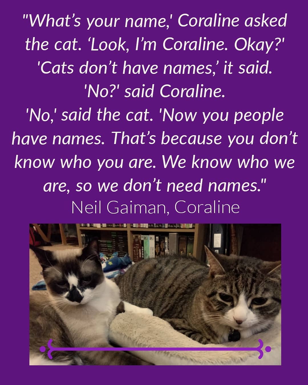 “What is actually your title,’ Coraline questioned the cat. ‘Look, I’m Coraline. Okay?’ ‘Cats really don’t have names,’ it claimed. ‘No?’ explained Coraline. ‘No,’ said the cat. ‘Now you individuals have names. That is mainly because you do not know who you are. We know who we are, so we never have to have names.” – #NeilGaiman , #Coraline #cats #instacat #catagram #catmemes #prices #catquotes #snowshoecatsofinstagram #snowshoecat #siamesecatsofinstagram #siamesecat #americanshorthaircatsofinstagram #americanshorthaircat #adoptdontshop #NYCACC